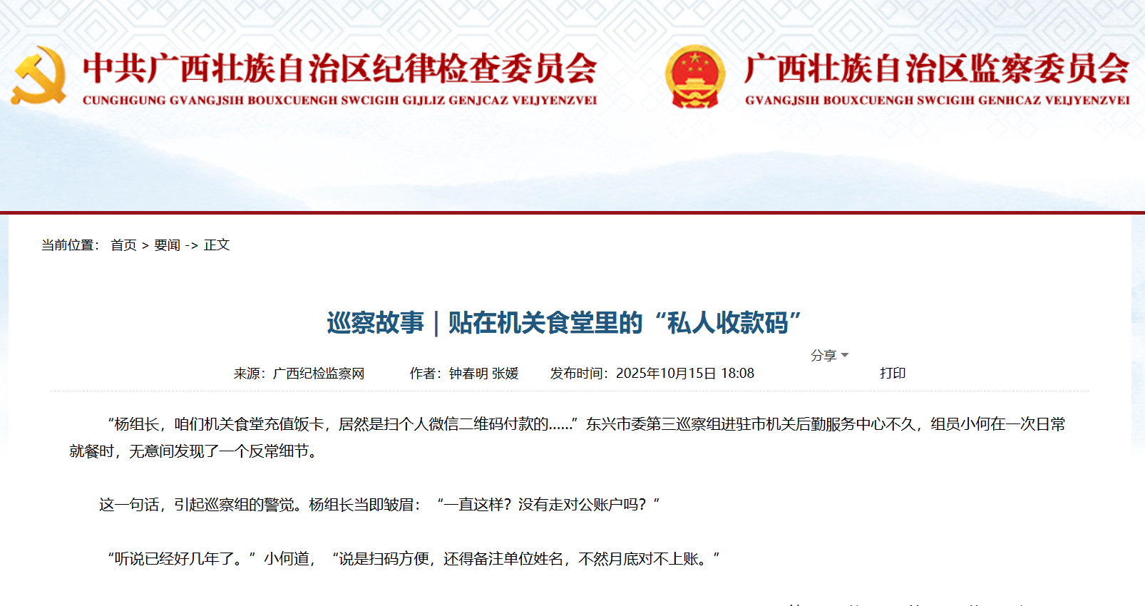 廣西紀(jì)檢監(jiān)察網(wǎng)|巡察故事|貼在機(jī)關(guān)食堂里的“私人收款碼”